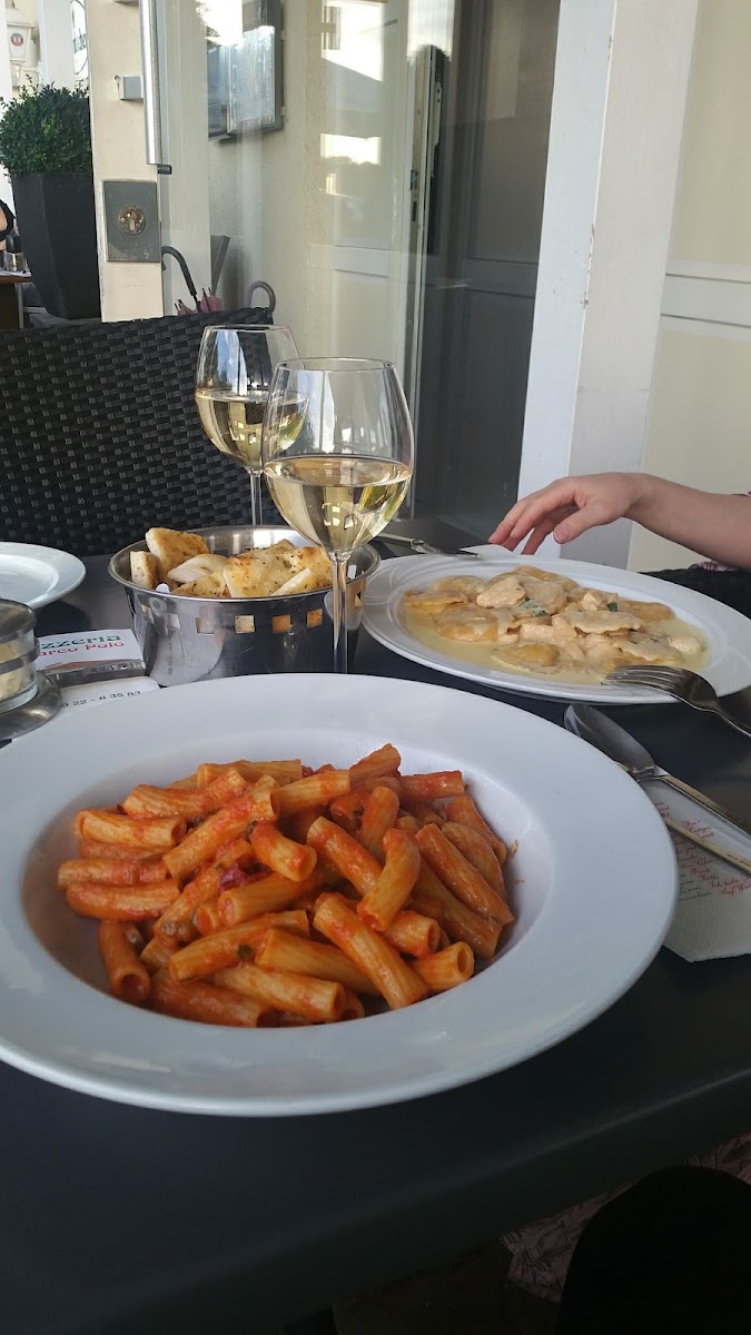 Der Service war freundlich und aufmerksam. Das Essen wurde schnell serviert. Der Gastraum ist nicht besonders groß und es war durch die Sonne und Küche ordentlich warm. Wie bereits mehrfach gehört, ist es bei gut gefülltem Restaurant zudem auch recht laut. Dennoch kann man durchaus sehr gut drin sitzen. Bei gutem Wetter auch draußen vor dem Restaurant, allerdings halt an der Danziger Straße. Wir haben uns zu dritt die Vorspeisen-Platte geteilt, die für unseren Geschmack für drei Personen genau richtig bemessen war und von uns restlos aufgegessen wurde. Es war eine sehr gute Mischung, mit dem leckeren Knoblauchbrot dazu, top abgestimmt. Ich hatte das Saltimboca und war zufrieden. Hat gut geschmeckt. Die gebutterten Nudeln dazu waren auch gut, die Rosmarin-Kartoffeln wären mir allerdings lieber gewesen, gab es leider aber nicht. Meine beiden Begleitungen waren mit ihren Nudeln auch sehr zufrieden. Für uns war es der erste Besuch im Restaurant Marco Polo. Wir kommen bei Gelegenheit gern wieder.